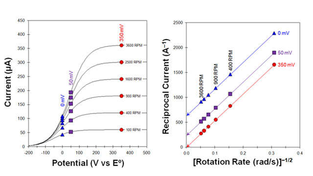 رسم جریان متقابل (i/1) در برابر ریشه متقابل نرخ چرخش زاویه ای (ω-1/2)، یک خط مستقیم با یک قطع برابر با جریان سینتیکی متقابل (1/iK) ایجاد می کند. جریان سینتیکی جریانی است که در غیاب هرگونه محدودیت انتقال جرم مشاهده می شود. با اندازه گیری جریان سینتیکی در انواع اضافه پتانسیل های مختلف در امتداد ولتاموگرام، می توان ثابت نرخ استاندارد را برای نیمه واکنش الکتروشیمیایی تعیین کرد.